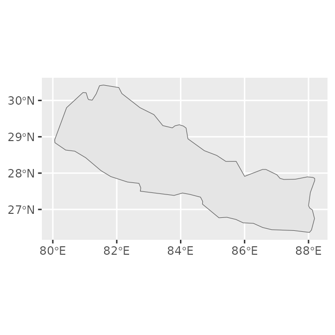 For this, we first obtain the country boundary of Nepal by using its iso3 string (“NPL”). Normally, you would need to provide your own data set with country boundaries to filter from. Data can be loaded from local machines in vector or raster format, or using a remote connection via postgres using the elsar_load_data() function. Here, we use a pre-saved dataset.