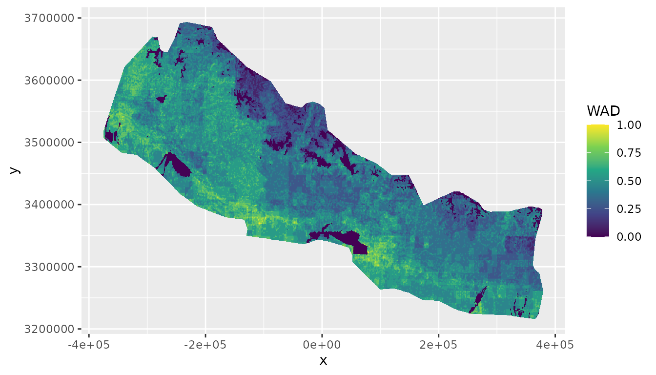#> [2026-04-03 09:19:47] WAD subset data loaded successfully.The data then needs to be re-projected and re-sampled to exactly match the resolution and extent of the previously created planning units. We also normalise the data to only have values within the range 0-1.